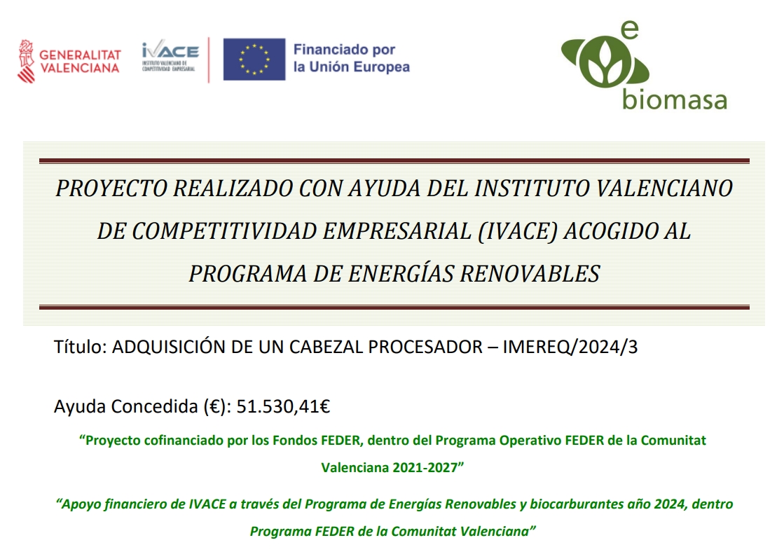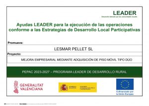 Lesmar Pellet, S.L. ha recibido por parte de la Conselleria de Innovación, Industria, Comercio y Turismo de la Generalitat Valenciana la subvención de 39.900,00€ en apoyo al proyecto INPYME/2023/123 dentro de “la sexta fase de implantación del Plan Estratégico de la Industria Valenciana, de ayudas para mejorar la competitividad y la sostenibilidad de las pymes de diversos sectores industriales de la Comunitat Valenciana”, para la compra de un manipulador telescópico.